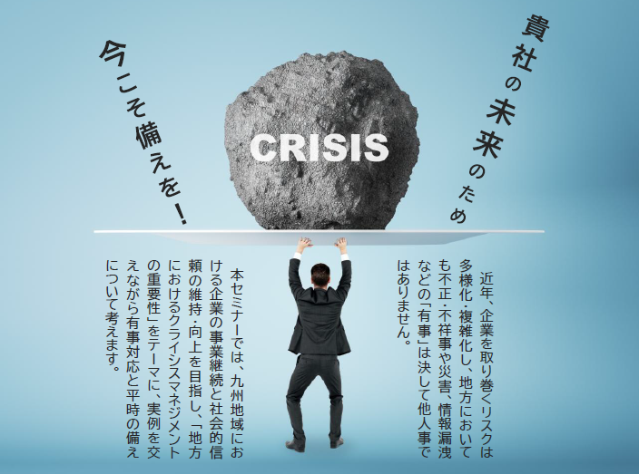 本セミナーでは、九州地域における企業の事業継続と社会的信頼の維持・向上を目指し、「地方におけるクライシスマネジメントの重要性」をテーマに、実例を交えながら有事対応と平時の備えについて考えます。